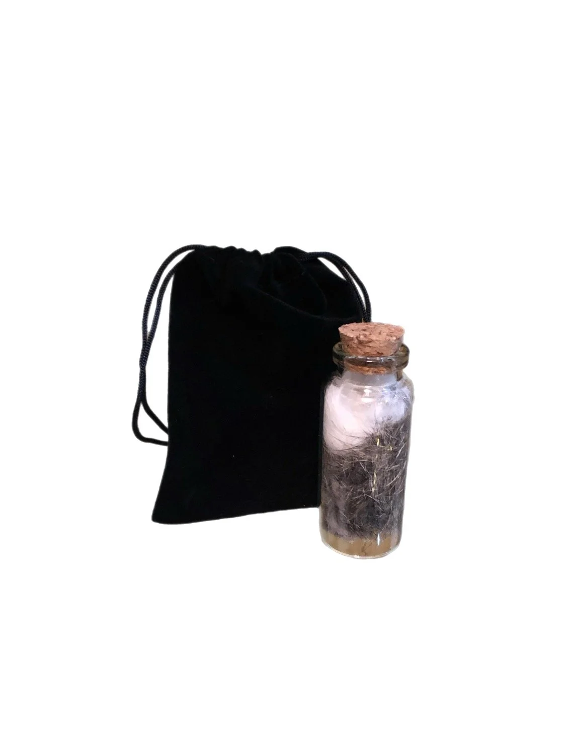A keepsake of your companion's hair in a miniature glass vial and velvet pouch